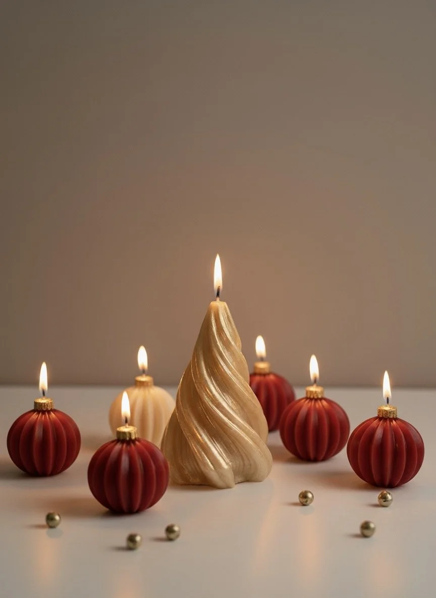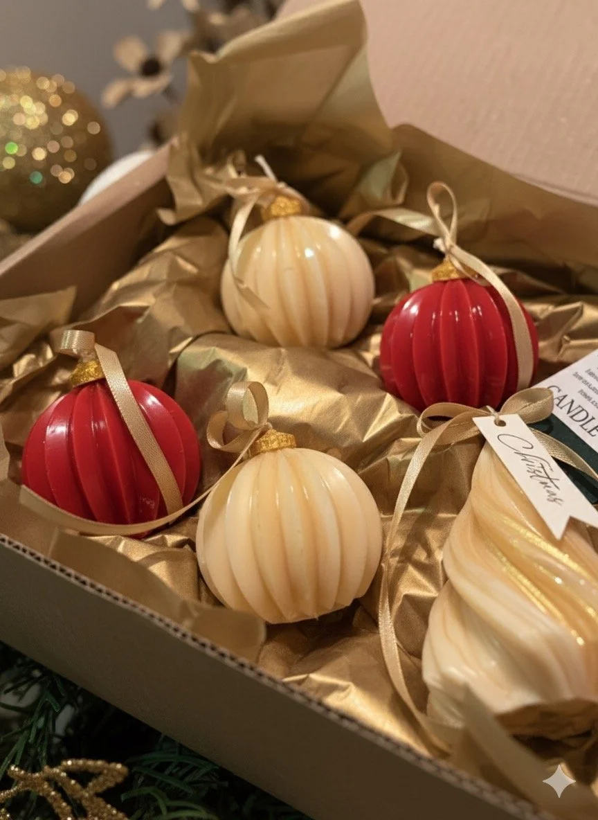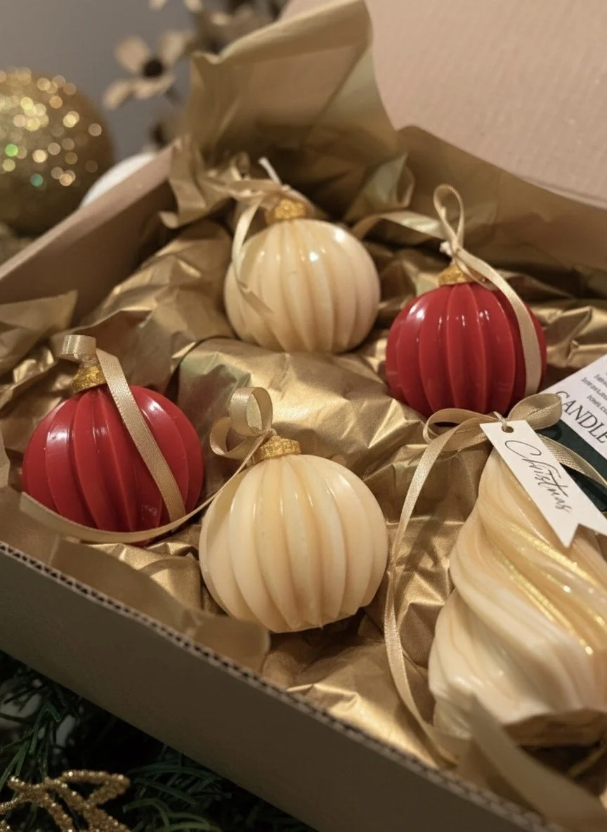 This dreamy collection features four shimmering Christmas bulb candles, hand-poured in bold ruby red and glistening gold, each scented with the warm, cozy sweetness of roasted chestnuts and brown sugar. It’s the kind of fragrance that feels like stepping into a bustling holiday market, mittens on, laughter in the air, and caramelized treats warming your hands.
