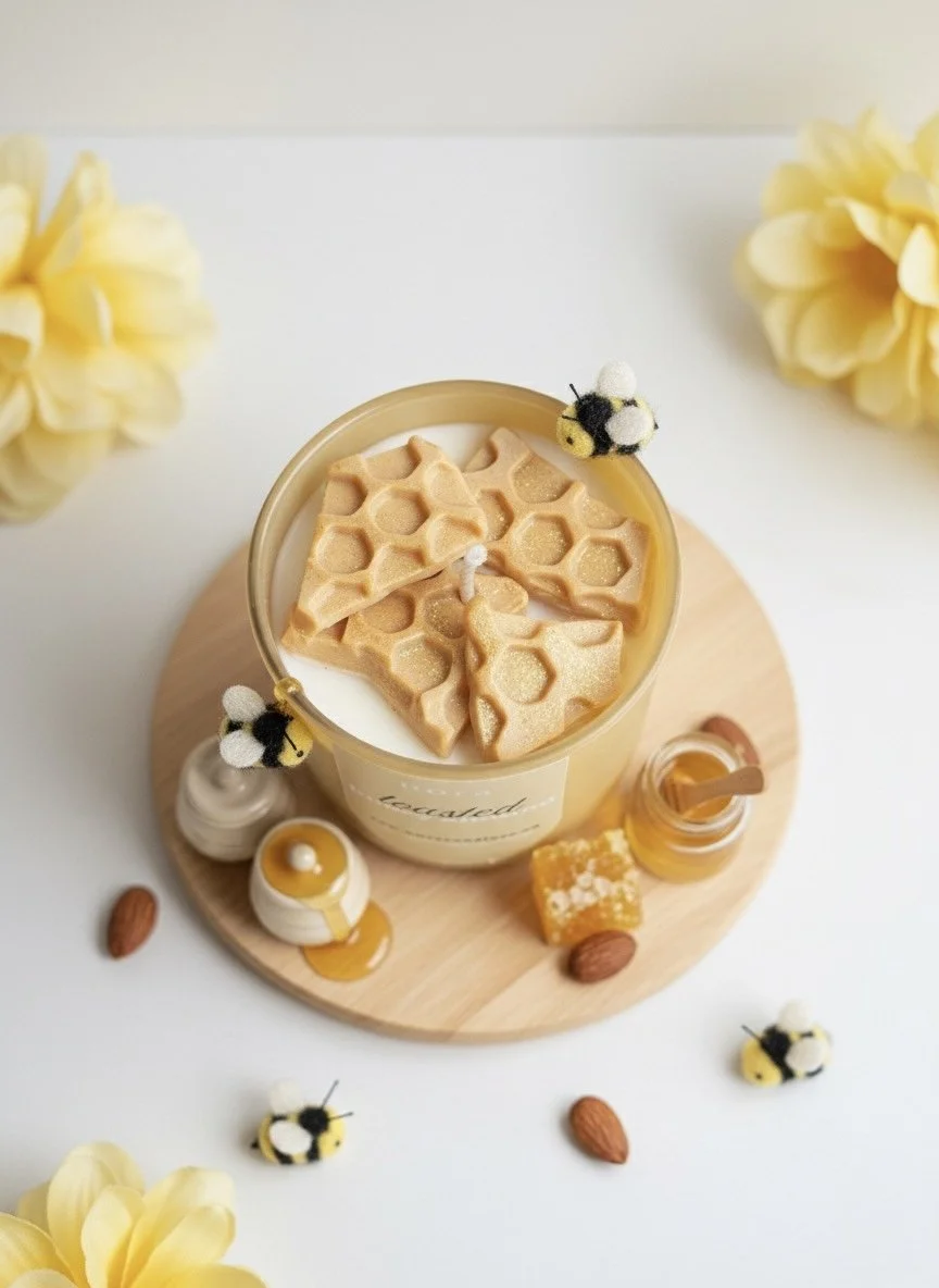 A warm, golden embrace of toasted almonds drizzled with rich, creamy honey. This comforting scent fills your space with nutty sweetness and soft gourmand notes, perfectly complemented by a delicate honeycomb wax topping that adds a touch of natural elegance and charm.
